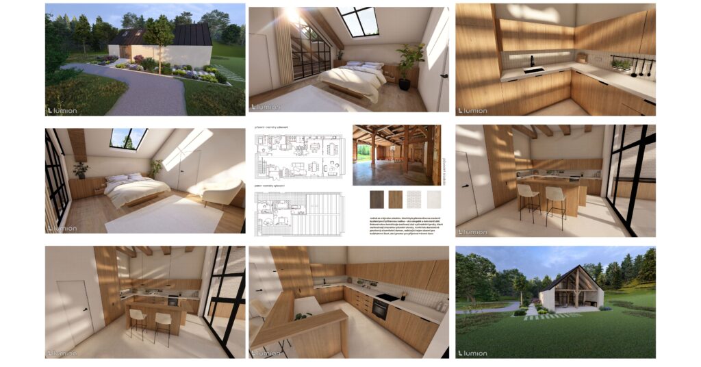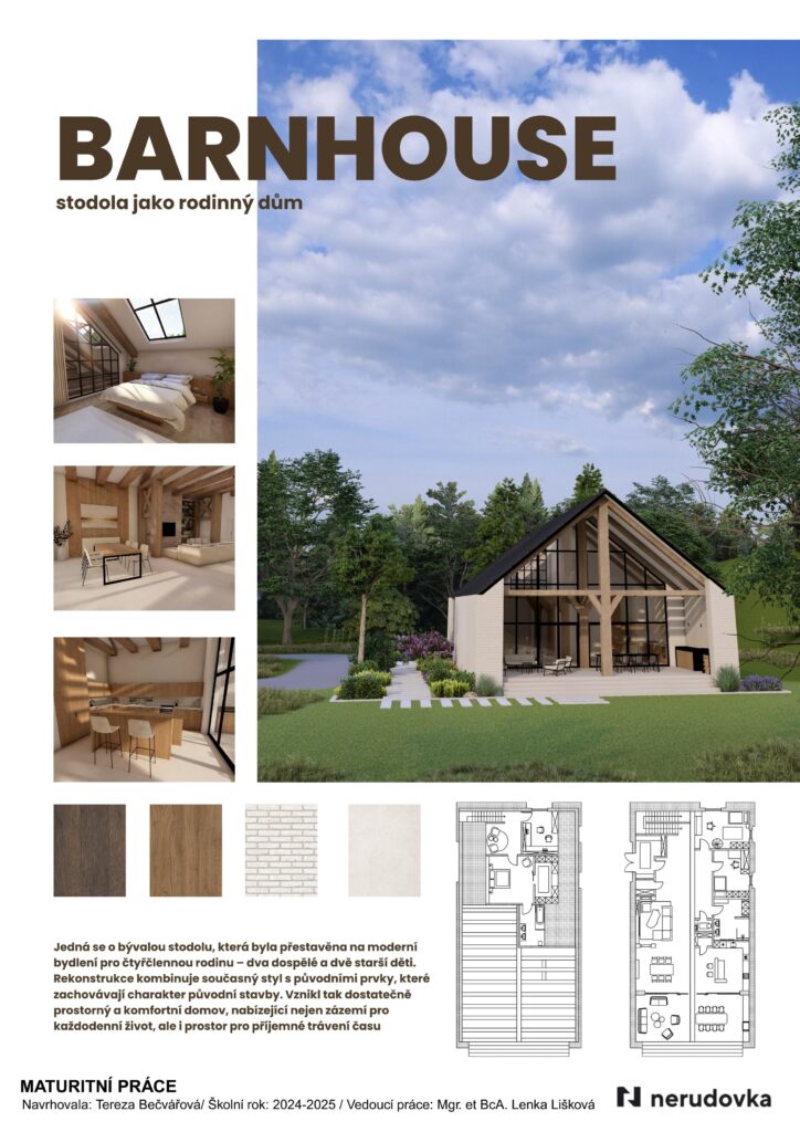 Tato práce se zabývá rekonstrukcí staré stodoly a proměnou jejího využití na moderní rodinný dům. Zadání vyžadovalo nejen dispoziční úpravy, ale i nové funkční řešení celého prostoru. Objekt stojí na kraji malé vesnice a zaujme svou původní dřevěnou konstrukcí, kterou jsem se rozhodla zachovat. V návrhu kombinuji rustikální prvky, jako jsou přiznané trámy, s moderním designem, přírodními materiály a velkými prosklenými plochami, které propojují interiér s okolní krajinou.