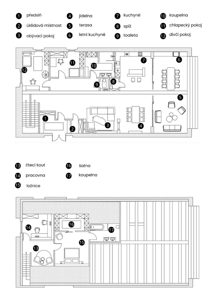 Konstrukční výzvou bylo například vytvoření částečného patra tak, aby v centrální části zůstal vysoký strop a zároveň vznikl klidný prostor pro ložnici a pracovnu. Dům je určen pro čtyřčlennou rodinu a nabízí vzdušné, praktické a osobité řešení s důrazem na detail a atmosféru. Projekt odráží můj osobní vkus a přístup k prostoru jako místu, které má nejen fungovat, ale i inspirovat. Vyniká citlivou prací s původní strukturou a netradičním dispozičním řešením.