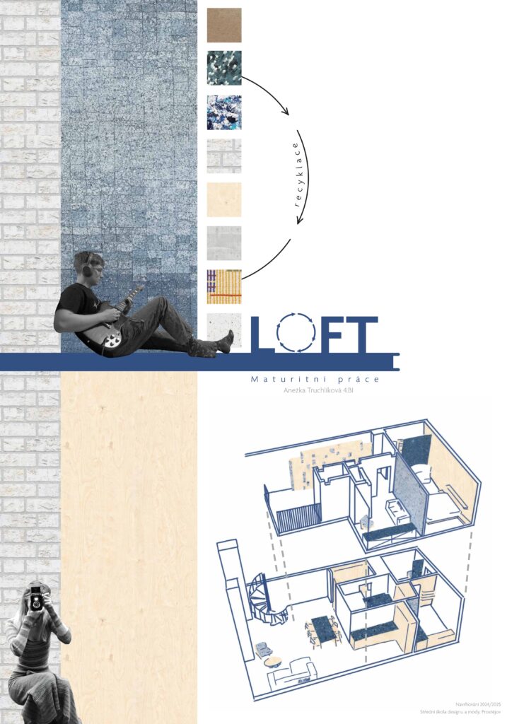 V dnešní době se snažíme najít využití pro staré věci, nejen kvůli penězům, ale i kvůli životnímu prostředí. Proč sem ale nezakomponovat i ostatní nevyužité věci, kterých máme po celém světě spousty? Právě z tohoto důvodu je hlavním tématem mé maturitní práce recyklace. Kombinuji recyklovanou látku a plast s tradičními materiály. V interiéru je přiznaný trámový strop a železobetonová konstrukce.