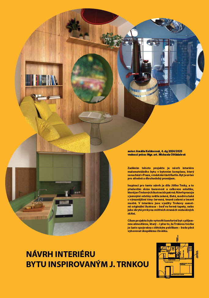 Inspirací pro tento návrh je dílo Jiřího Trnky, a to především skrze barevnost a celkovou estetiku, která je v Trnkových ilustracích patrná. Návrh pracuje s jemnými odstíny světle zelené, žluté, modré a také s výraznějšími tóny červené, tmavě zelené a tmavě modré. V interiéru jsou využity Trnkovy samotné originální ilustrace – buď ve formě tapety, nebo jako skryté prvky na vnitřních stranách vestavěných skříní.