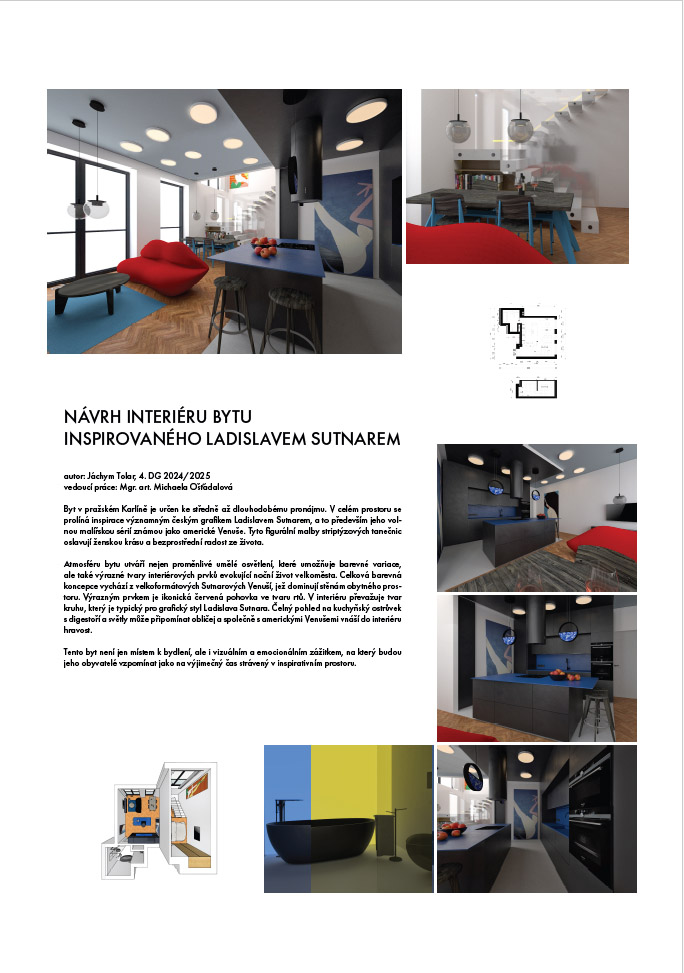 Byt v pražském Karlíně je určen ke středně až dlouhodobému pronájmu. V celém prostoru se prolíná inspirace významným českým grafikem Ladislavem Sutnarem, a to především jeho volnou malířskou sérií známou jako americké Venuše. Tyto figurální malby striptýzových tanečnic oslavují ženskou krásu a bezprostřední radost ze života.