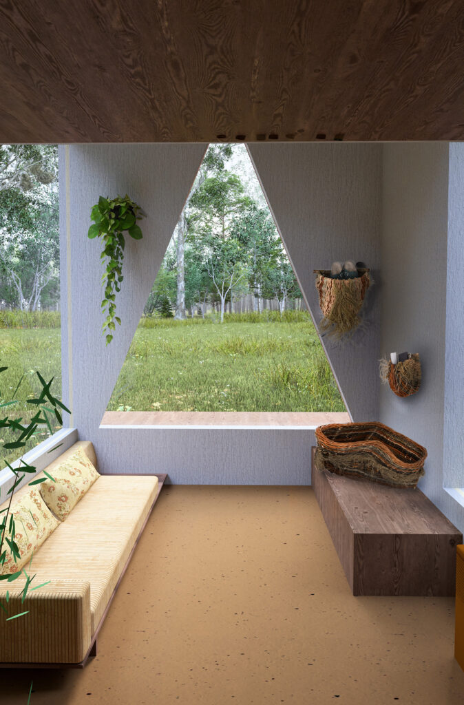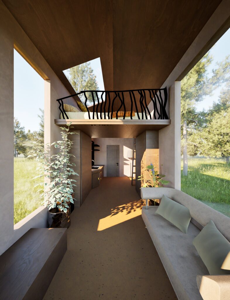 Interiér tvoří jeden prostor s patrem pro spaní, koupelna je umístěna odděleně na konci dispozice. Využity jsou především přírodní materiály jako dřevo či marmoleum, hlavní roli hraje okolní příroda.