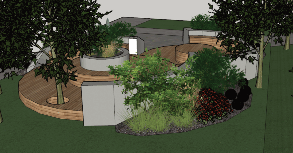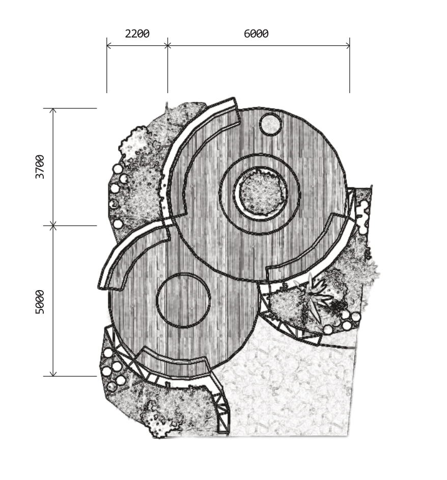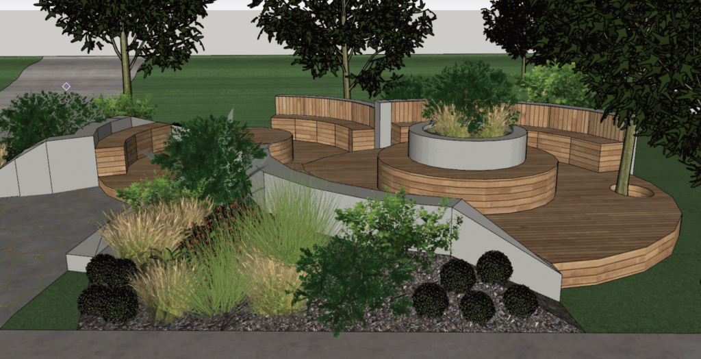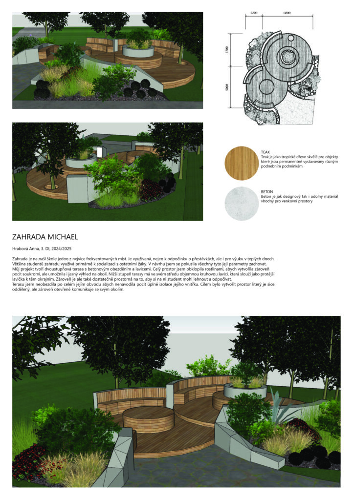 Můj projekt tvoří dvoustupňová terasa s betonovým obezděním a lavicemi. Celý prostor jsem obklopila rostlinami, abych vytvořila zároveň pocit soukromí, ale umožnila i jasný výhled na okolí. Nižší stupeň terasy má ve svém středu objemnou kruhovou lavici, která slouží jako protější lavička k těm okrajním. Zároveň je ale také dostatečně prostorná na to, aby si na ní student mohl lehnout a odpočívat.