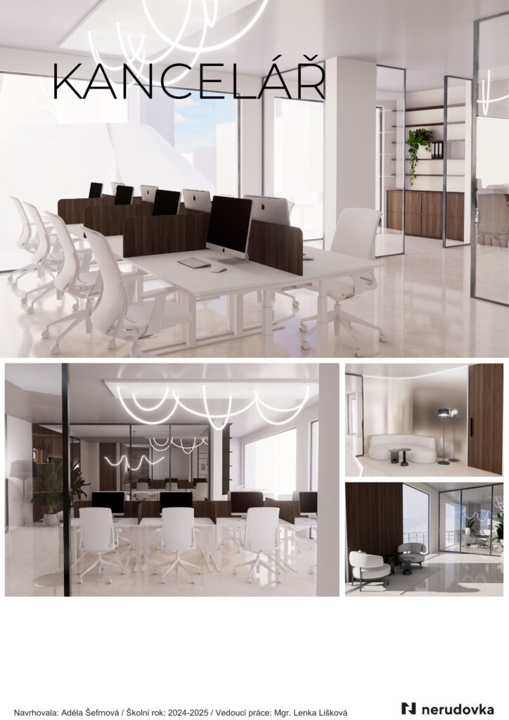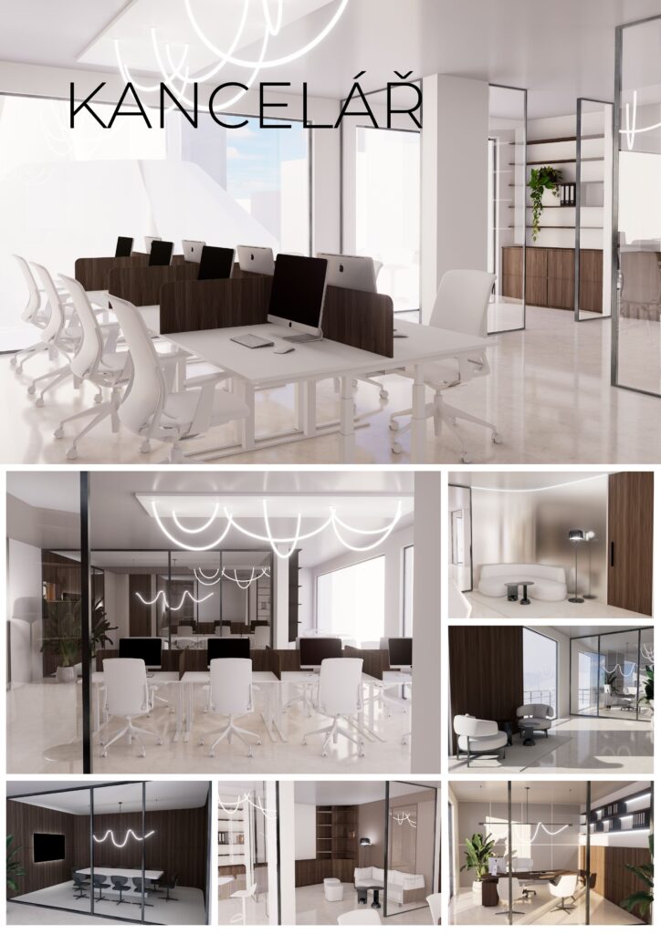 Cílem projektu bylo navrhnout kancelářské prostory pro designéra v Plzni dle zadaného půdorysu a funkčního schématu. Prostor musel splňovat požadavky na praktické využití, ale zároveň reflektovat kreativitu a estetickou úroveň odpovídající oboru designu. Interiér je koncipován jako vzdušný a čistý s důrazem na jednoduché linie a kvalitní materiály. Použila jsem kombinaci bílých povrchů, dřevěného dekoru a kovových prvků, což vytváří vyvážený kontrast tepla a industriální estetiky. Důležitým prvkem je designerský nábytek a svítidla, která prostor vizuálně pozvedají a podtrhují jeho profesionální charakter. Neobvyklým řešením je použití výrazného obkladu z plechu v kombinaci s jemnějšími strukturami, což vytváří specifickou atmosféru. Projekt se odlišuje důrazem na vizuální čistotu při zachování plné funkčnosti, což podporuje soustředění i kreativní proces.Interiérový design – Studio interiérového designéra