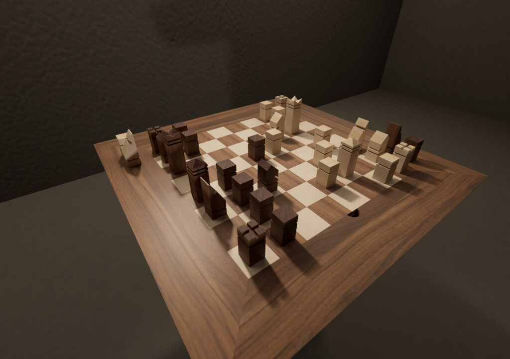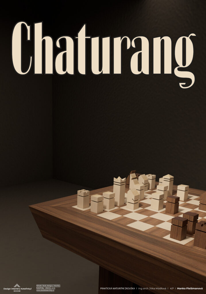 Chaturang je návrh šachového stolu, který vznikl jako praktická maturitní práce. Je celý vyroben z masivního dřeva, konkrétně z tmavého ořechu a světlé břízy. Kombinace těchto dvou kontrastních materiálů vytváří elegantní a nadčasový vzhled. Hrací plocha je vyjímatelná a pod ní se nachází praktický úložný prostor pro šachové figurky. Ty jsou rovněž z masivu a navržené v originálním, minimalistickém stylu. Každá figurka má svůj vlastní charakteristický tvar, který vychází z jednoduchých geometrických forem.