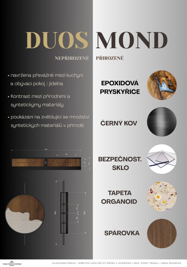 Duos Mond byla navržena jako klauzurní práce na téma dělící prvek v interiéru. Mezistěna je určena především do prostoru mezi kuchyní a obývacím pokojem, jídelnou nebo do interiéru restaurace.