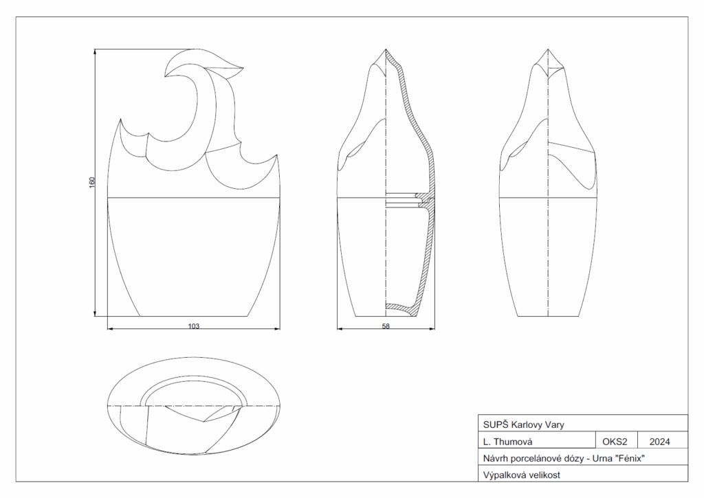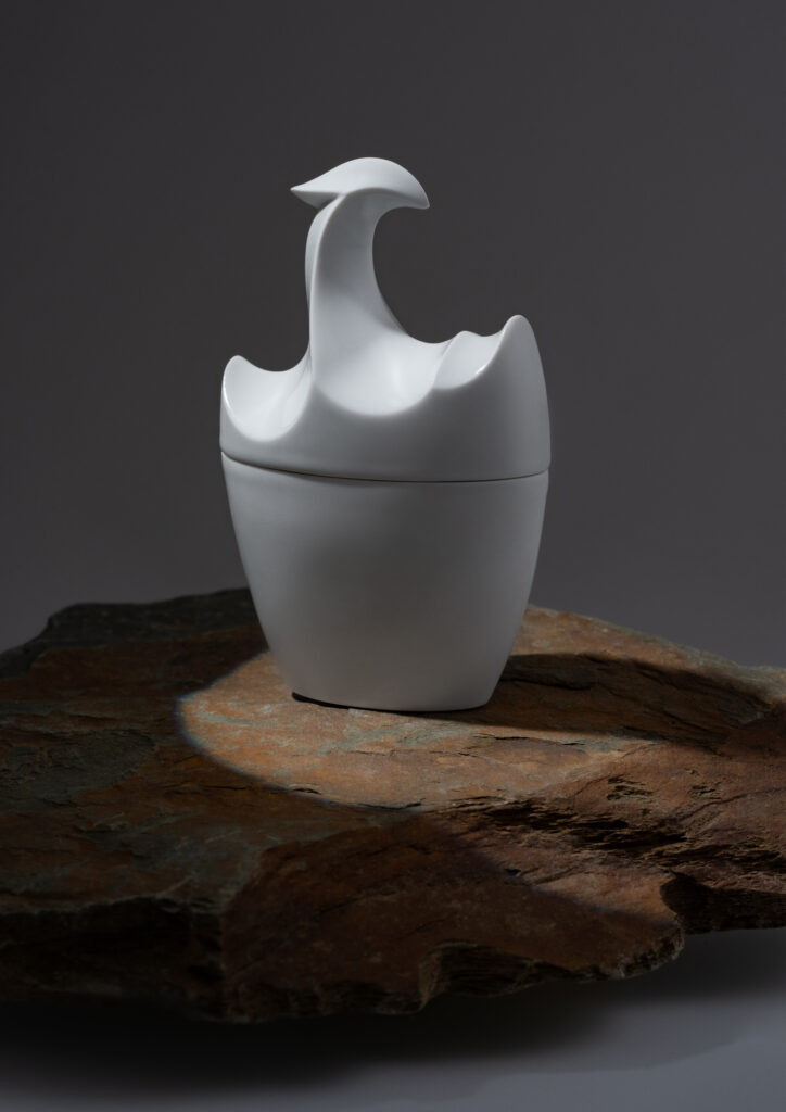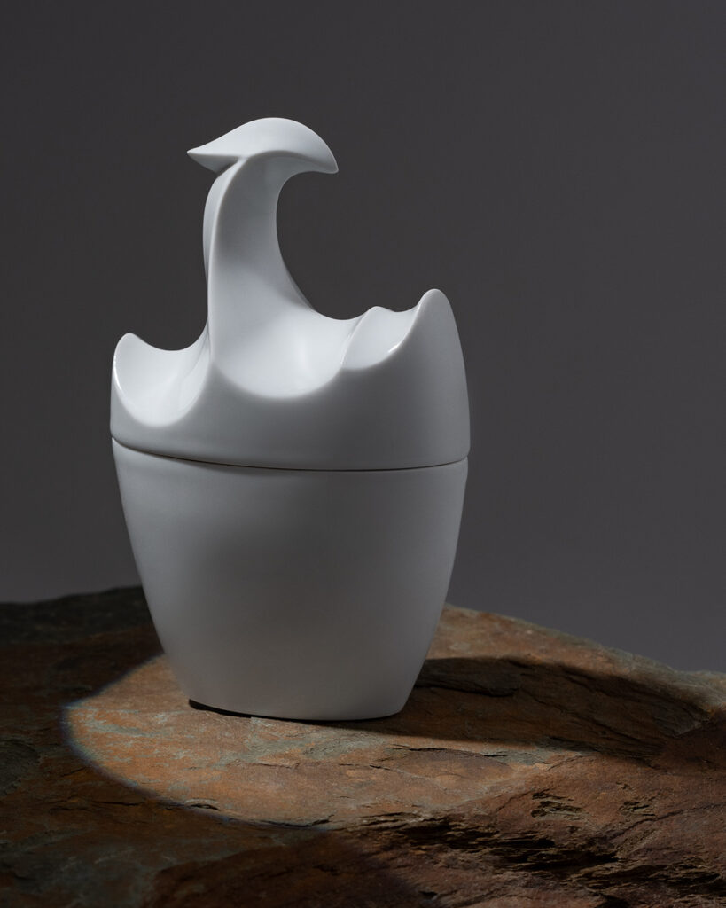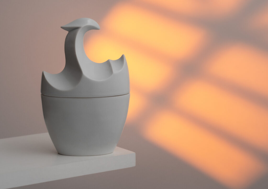 Při návrhu porcelánové urny jsem se inspirovala známým mytologickým tvorem – ptákem Fénixem. Podle legendy Fénix po smrti shoří a z vlastního popela znovu ožívá. Je proto považován za symbol znovuzrození, nesmrtelnosti a života po smrti.