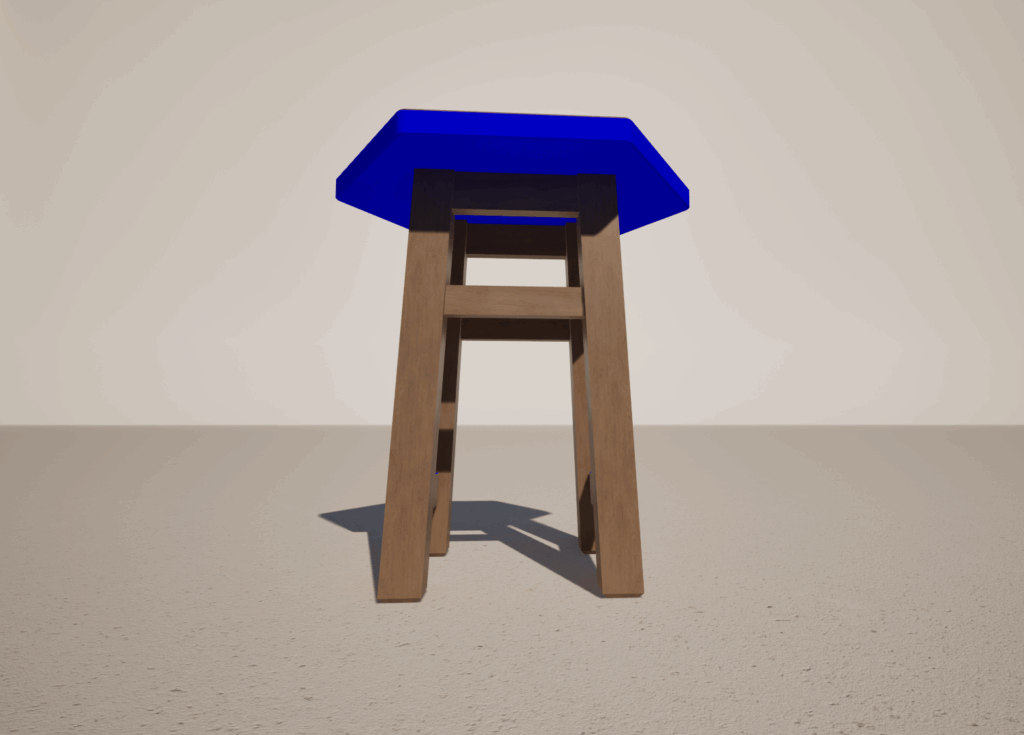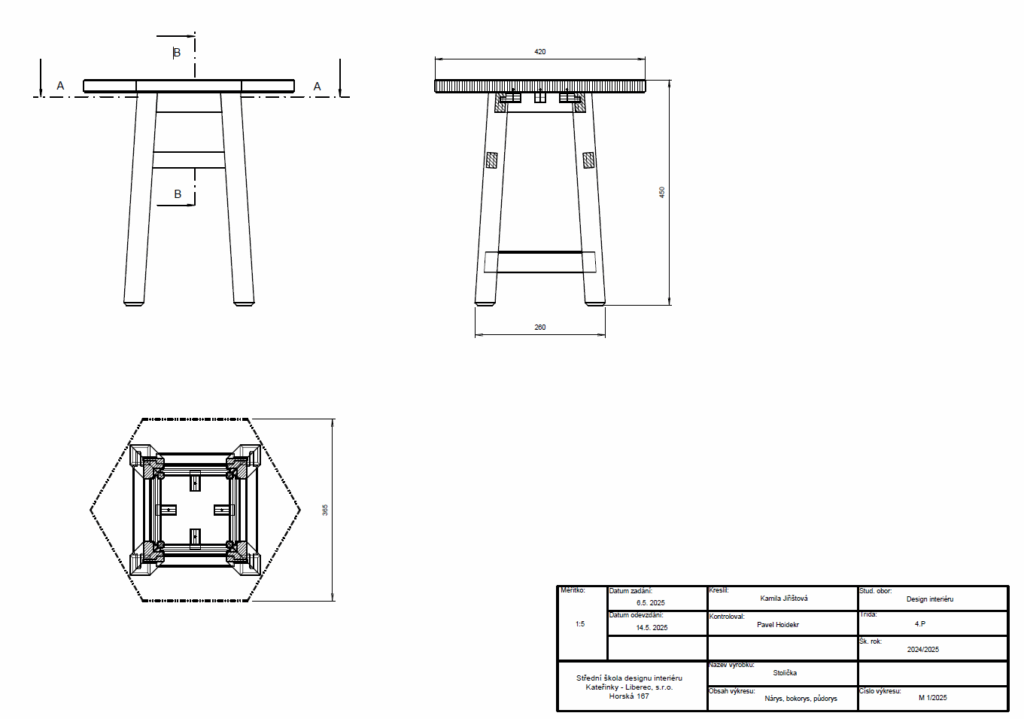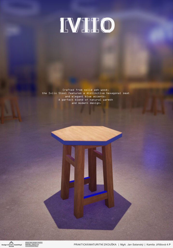 Stolička z masivního dřeva z jasanu, s modrými detaily. Koncept navazuje na předešlý projekt – renovace prostoru paláce Dunaj v Liberci. Sedák stoličky je inspirován šestiúhelníkovým tvarem světel v paláci Dunaj.