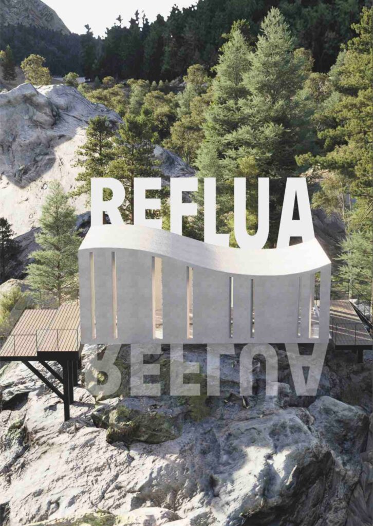 Stavba se nachází v pískovně Adršpach a svým tvarem i materiály reaguje na okolní krajinu. Tvar vlny symbolizuje pohyb, návrat a plynutí, zatímco použitý pohledový beton odkazuje na surovost a klid pískovcových skal. Voda proudí v uzavřeném ekologickém systému, který využívá přírodní filtrace (štěrk, vodní rostliny) a tiché nízkotlaké čerpadlo. Věž Reflua se odlišuje tichým, neokázalým přístupem. Místo vertikály volí horizontální linii, místo technického dojmu přináší prožitek a vnitřní klid. Projekt tak propojuje architekturu, přírodní principy a lidské vnímání do harmonického celku.