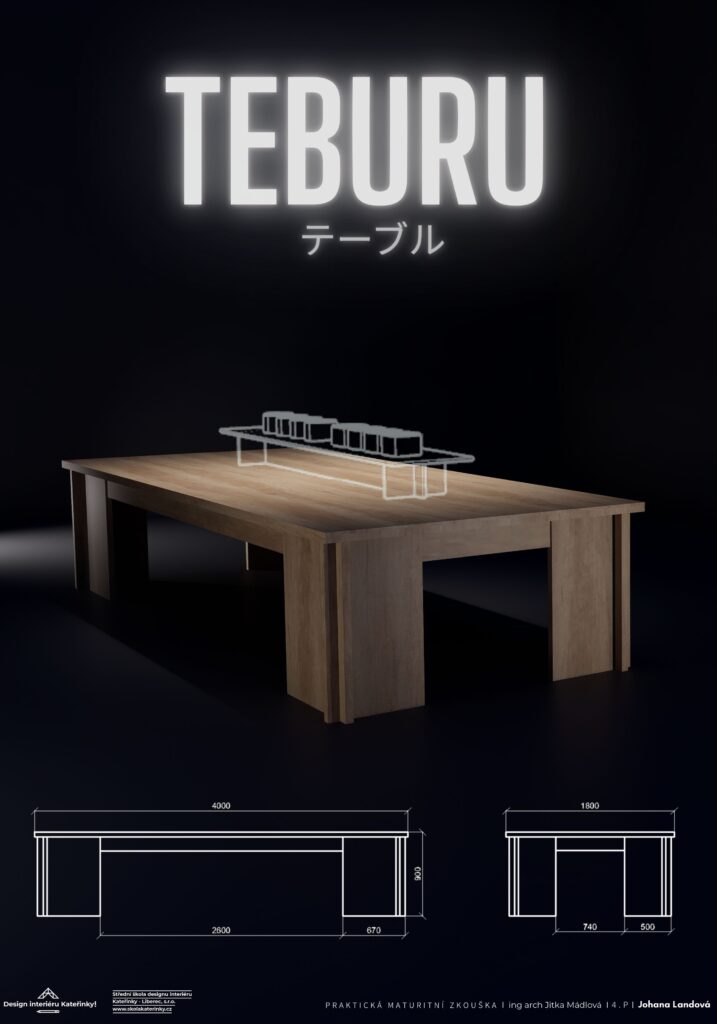Tento výstavní stůl je inspirován mou stáží v Japonsku, kde jsem měla možnost intenzivně vnímat tamní estetické principy a způsob uvažování o prostoru, předmětech a jejich významu. Japonská kultura mě silně ovlivnila především svou schopností nacházet krásu v jednoduchosti, čistotě tvaru a respektu k prázdnu. Tyto myšlenky se staly základem návrhu stolu, který je záměrně zbaven veškeré ornamentálnosti a ponechán v maximálně redukované podobě.